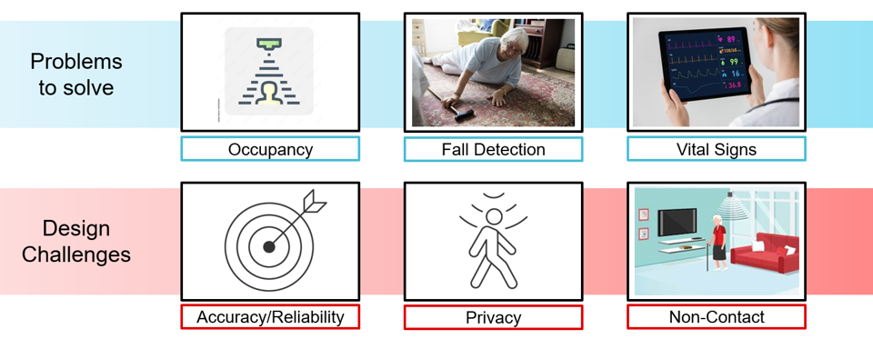 如圖1所示,這些醫(yī)用傳感器均面臨各自的挑戰(zhàn)。為確保有效運行,消費者必須記得佩戴并為其充電,這可能會影響舒適性或可行性。有些型號需要患者在發(fā)生健康事件時按下按鈕,但如果患者無行為能力時,便無法發(fā)揮作用。最后,傳感器需要非常準確,以便區(qū)分跌倒事件和日常活動。當一個人快速坐下或拍手時,當前的傳感器往往會誤判。某些類型的傳感器(如光學攝像頭中使用的傳感器)放置在家中時,也會產(chǎn)生隱私問題。