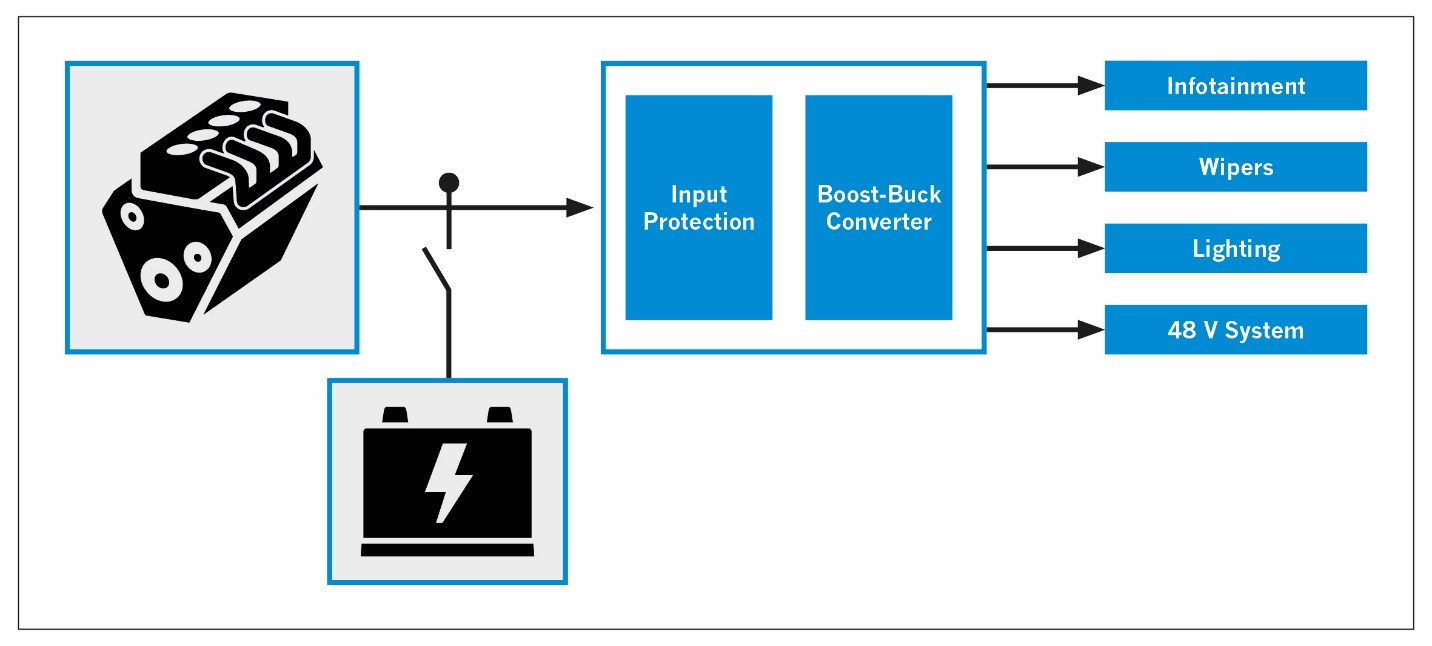 現(xiàn)代車輛中的所有車載電子設(shè)備都連接到電池和交流發(fā)電機。車輛交流發(fā)電機是一個三相發(fā)電機,產(chǎn)生的交流電壓通過整流二極管轉(zhuǎn)換為脈沖直流電壓,其電壓水平的波動取決于當(dāng)前的功率要求,包括發(fā)電機(發(fā)動機)的速度和擋風(fēng)玻璃加熱、車燈、信息娛樂系統(tǒng)等設(shè)備。