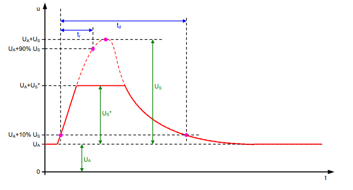 圖 4:考慮集中拋負載保護的脈沖 5b,鉗位電壓 US*因項目而異。